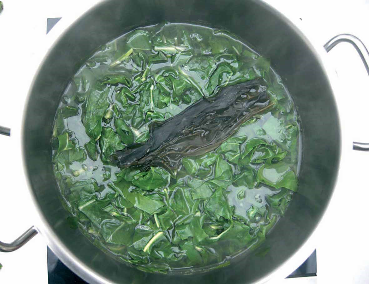 Ingrédients pour 4 à 5 pers.3 à 4 oignons6 feuilles de bettes (ou poirée)algue WakaméUstensiles conseillés :1 marmite inox 20 cm1 faitout 24 cm