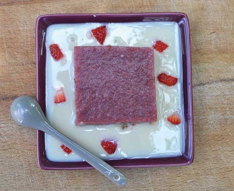 Idée : entourer le dessert d'une crème dessert vanille (à délayer avec un peu d'eau froide).